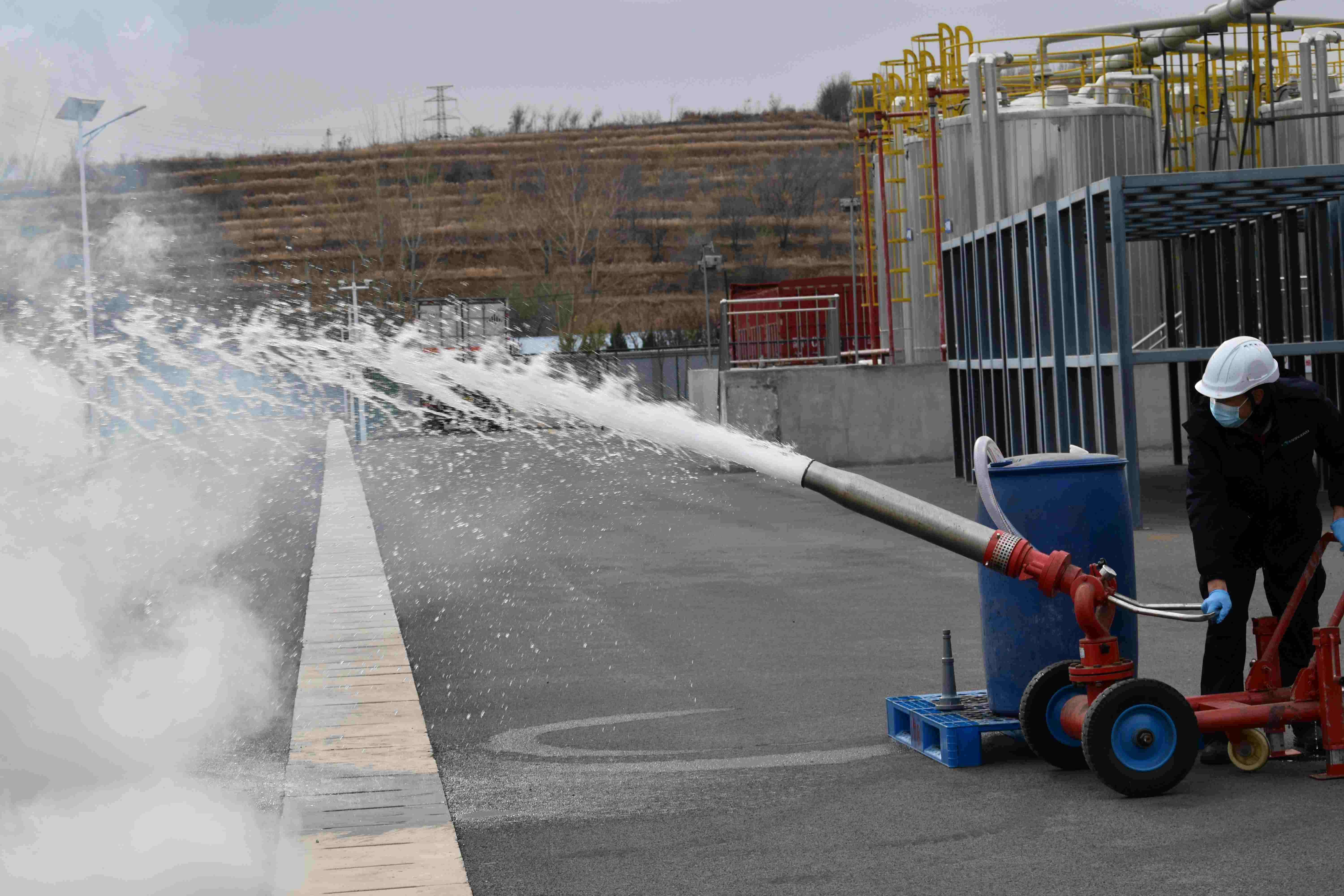 消防演練正式開始,薛副總宣布啟動“環(huán)保消防應(yīng)急預(yù)案演習(xí)”,接到丙類罐區(qū)火情報警信息后,李經(jīng)理立即啟動應(yīng)急預(yù)案,各小組按應(yīng)急預(yù)案快速投入滅火、救治等工作中。通訊與警戒組現(xiàn)場進行調(diào)度、警戒,并對火災(zāi)現(xiàn)場進行封鎖。醫(yī)療救護組對傷員進行轉(zhuǎn)移、臨時急救。搶險搶修組身著滅火服對著火點實施滅火。